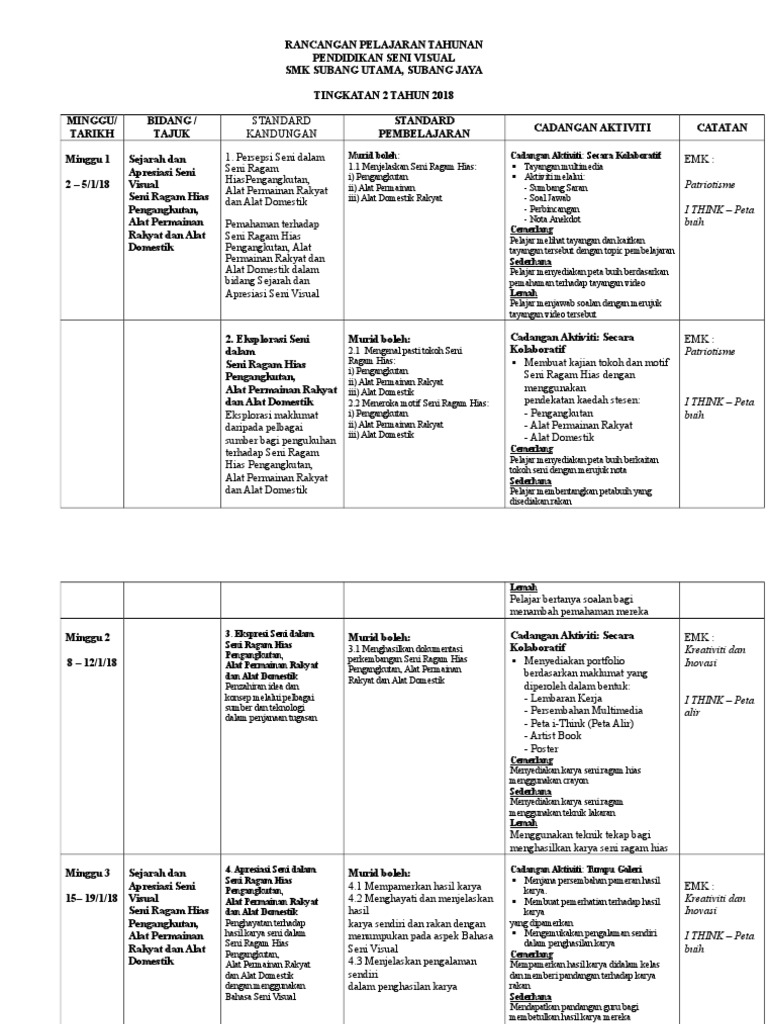 Rpt Seni F2 Kssm Docx Ringkasan Pengajaran Tahunan Kssm Psv Ting 2 Minggu Standard Kandungan 1 Seni Ragam Hias Pengangkutan Alat Permainan Rakyat Dan Course Hero