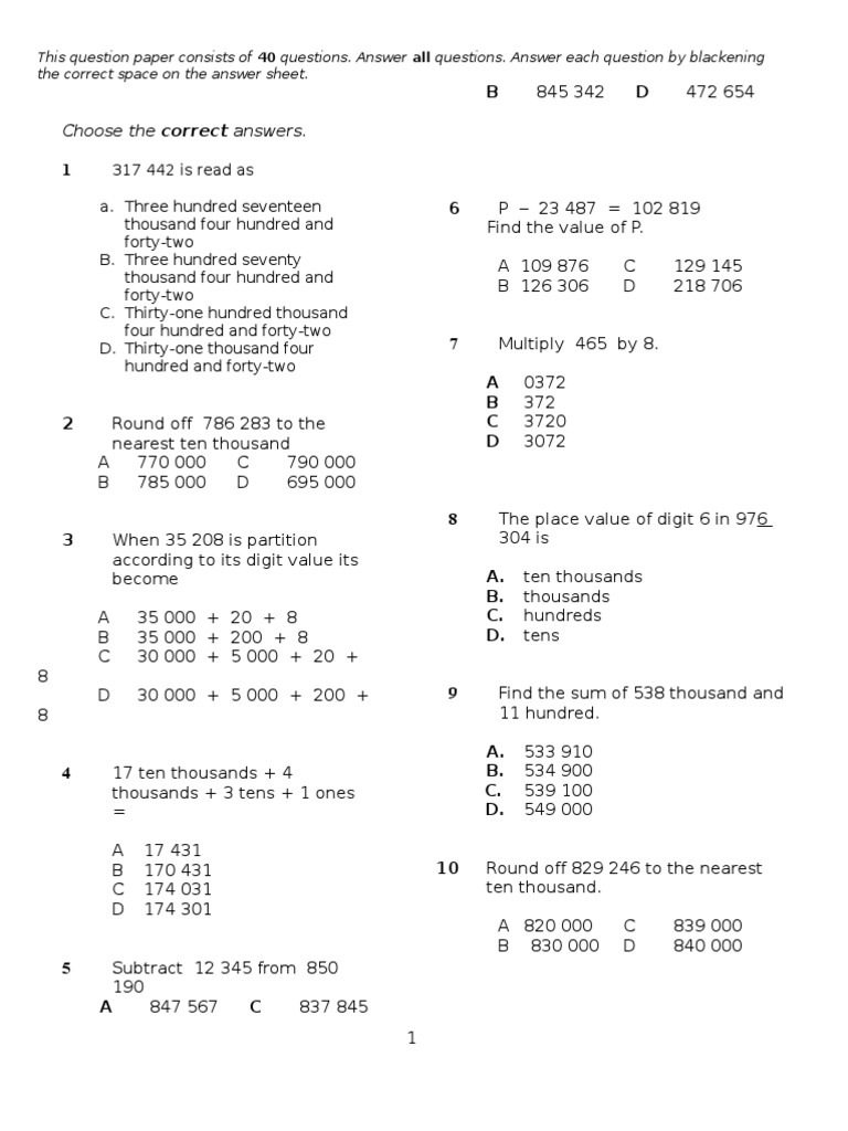 Peperiksaan Pertengahan Tahun Matematik Tahun 5 Kertas 1 Exam Worksheets Wicca