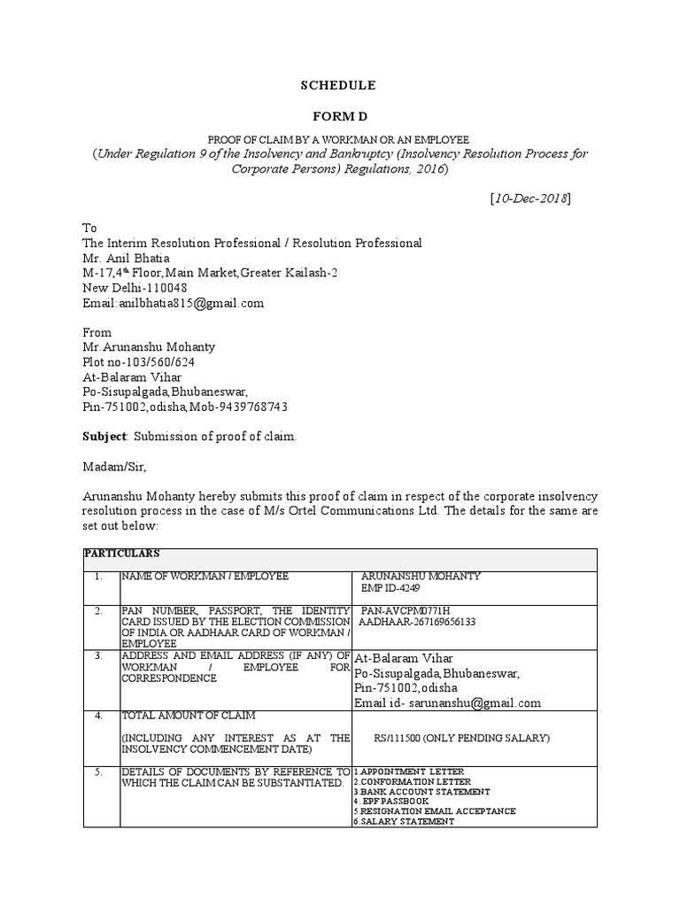Schedule Form D Corporate Persons Regulations 2016 Bankruptcy Private Law